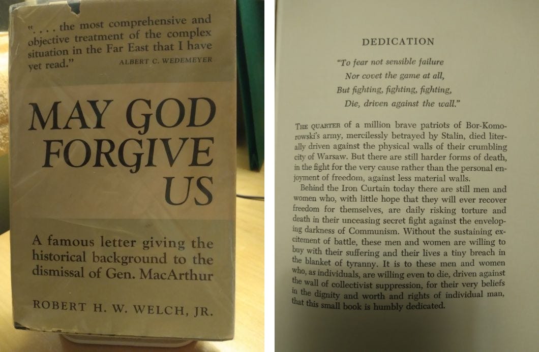 After giving a speech about Truman’s secretary of state Dean Acheson and General Douglas MacArthur to the New England Council of Young Republicans, a fellow businessman wrote him a letter with questions about his speech. In response, Welch wrote him a long letter on July 4, 1951 explaining why Truman fired Douglas MacArthur as head of the U.N. Command in South Korea. His friend apparently shared the letter with others, as people began requesting copies of it. Eventually, the letter was published as a book, entitled May God Forgive Us in 1952.